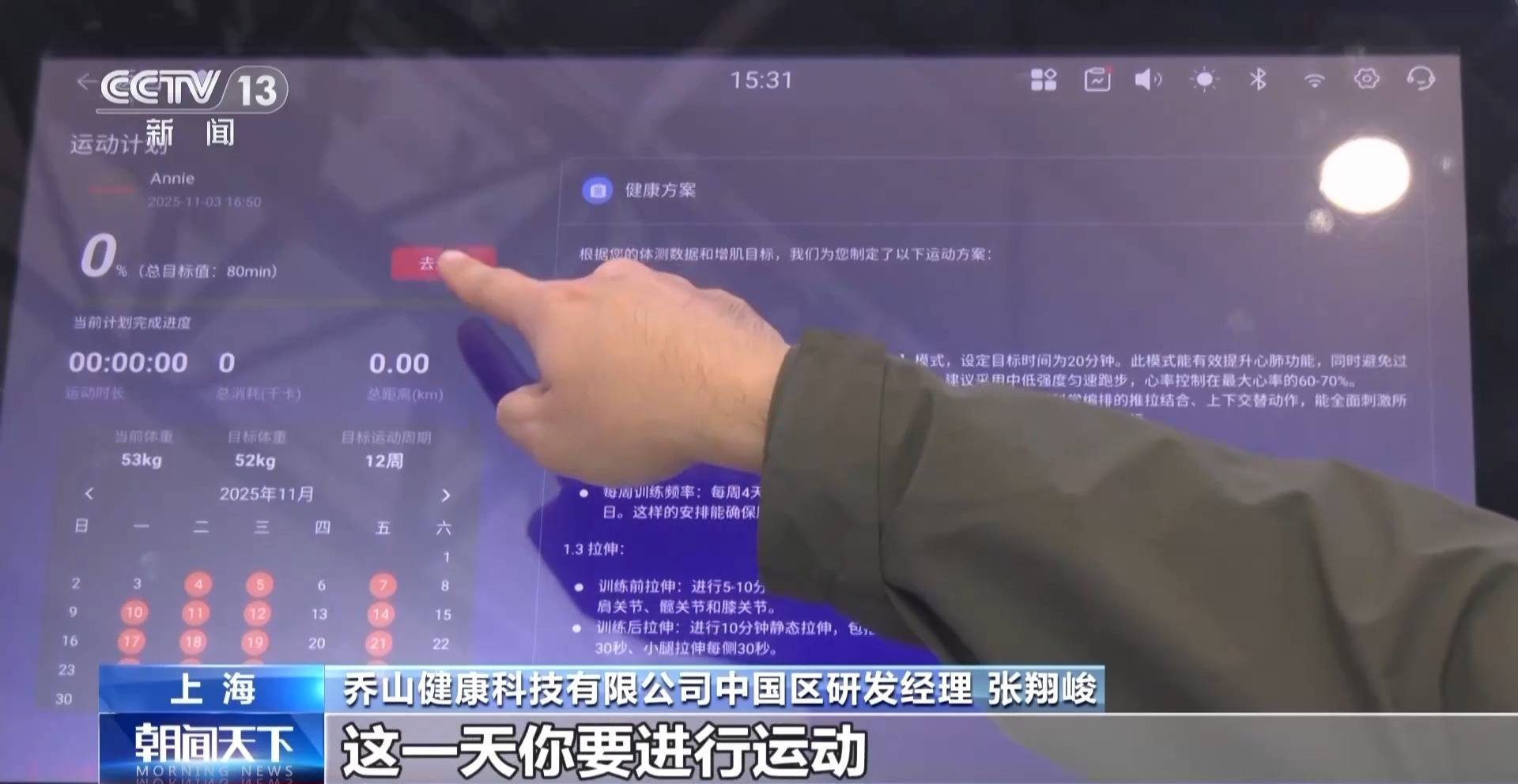 乔山健康科技有限公司中国区研发经理 张翔峻:AI给你提供方案,也会自动同步到器械上面。这边是你的运动的日历,橘色标志代表着这一天你要进行运动,运动方案已经给你设置好了,你的目标的时间、坡度、速度都已经帮你设置好。