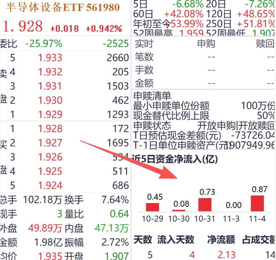 ETF方面,“设备”含量较高的热门国产替代品种——半导体设备(561980)收涨0.94%,最近五个交易日内实现连续4日“吸金”共2.13亿元,显示资金正在市场波动期间持续布局该领域。