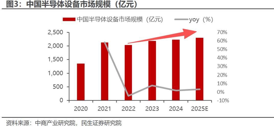 再加上受益于国家政策、AI浪潮、周期上行、自主可控持续推进等因素万生优配,近年来我国半导体设备市场规模持续增长。根据中商产业研究院,2023年中国半导体设备市场规模约为2190.24亿元,占全球市场份额的35%,2024年约为2230亿元,预计2025年中国半导体设备市场规模将达2300亿元。